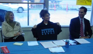 They are also sending out a photograph of Palin with a T-shirt that reads "NOWHERE ALASKA 99901”:Then there's this article from Charles Homans Watch Out, Russia: Sarah Palin is Coming! saying she's not the first to claim foreign policy experience (and money) because Alaska is next to Russia.